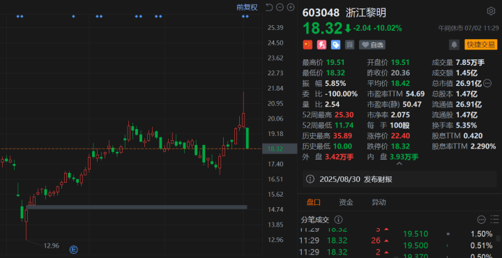 格隆汇7月2日|昨日盘中涨停的浙江黎明(603048.SH)今日开盘直线下挫封跌停板,报18.32元,总市值26.9亿元。消息上,浙江黎明发布股份减持公告,股东舟山市易凡股权投资合伙企业(有限合伙)拟减持公司股份不超过430万股,减持比例不超过公司总股本的2.93%。值得注意的是,公司实际控制人俞黎明、郑晓敏及其一致行动人俞振寰承诺自2025年7月2日起至2026年7月1日止不减持公司股份。(格隆汇)